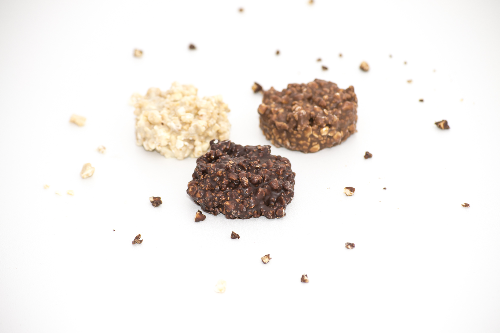 Contundentes y compactas rocas de almendra caramelizada envuelta en chocolate blanco, chocolate negro y chocolate con leche.